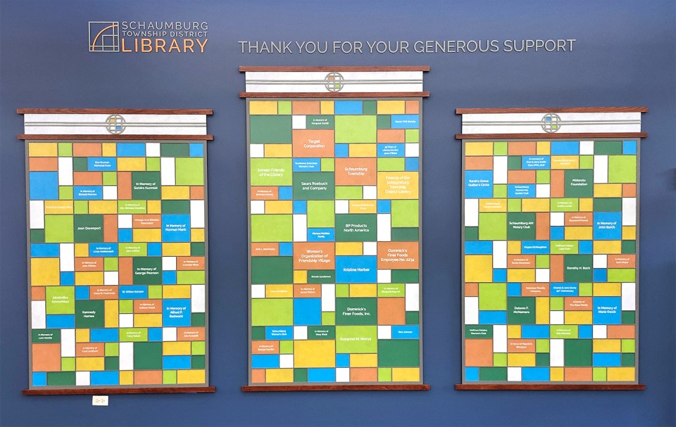 Thanks to Schaumburg Library Art Committee and Friedman Fine Art, this impactful installation in the Central vestibule, showcases past and present donors with their names engraved on a colored brick, perfectly complementing our updated building and color scheme.